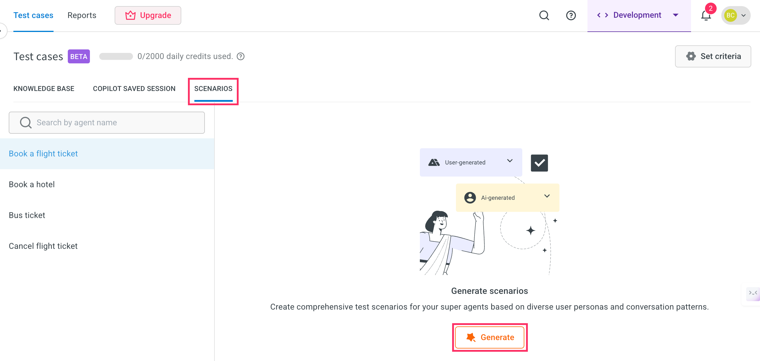 - Test scenarios can only be generated if your agent has configured start trigger or prompt. If your agent is created without these configurations, the Generate button will be disabled.