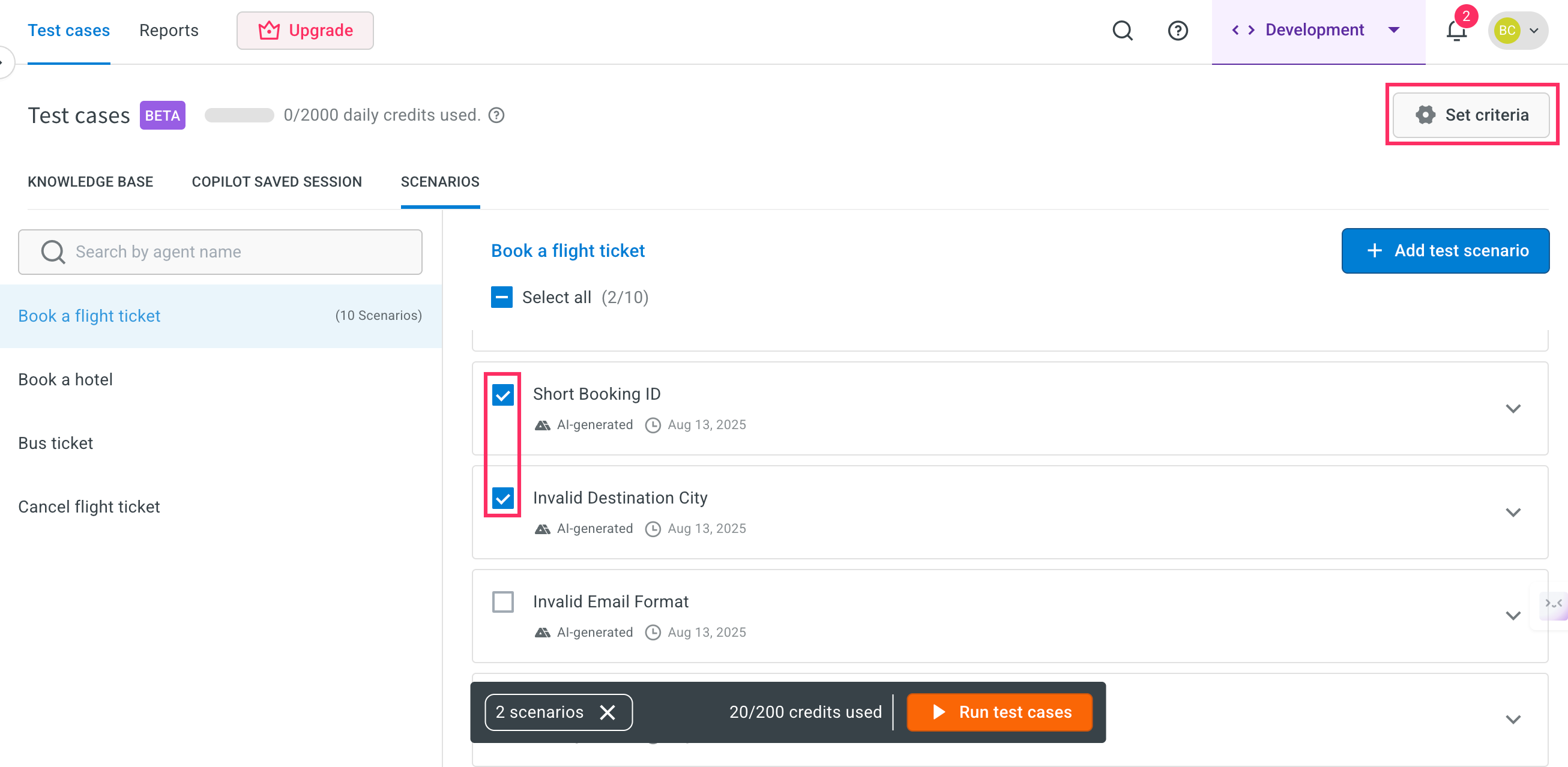 In the Scenarios tab, select the testcases and click on Set criteria for the test case you want to configure.
