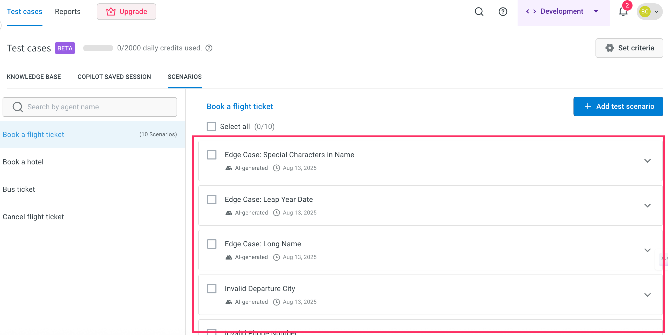 Testing works on a credit system with a daily limit of 2,000 credits. Credits can be used for Knowledge Base, Copilot sessions, and Scenario-based tests. Each Knowledge Base test case consumes 1 credit per test case, while each Copilot session and Scenario-based test case consumes 10 credits.
