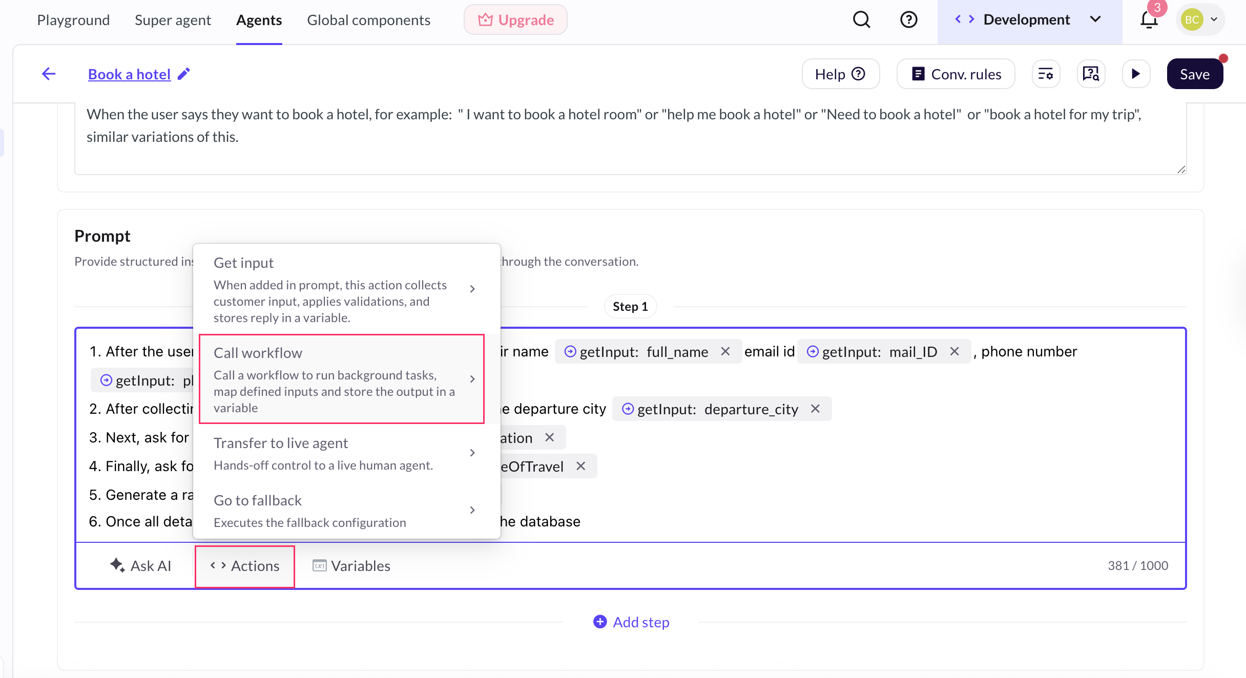 A workflow is a predefined action or process your AI agent can trigger during a conversation. Use this option to execute tasks like retrieving booking details, processing payments, verifying user information, or updating records. You can pass user inputs as variables to the workflow and capture the output for use in later steps.