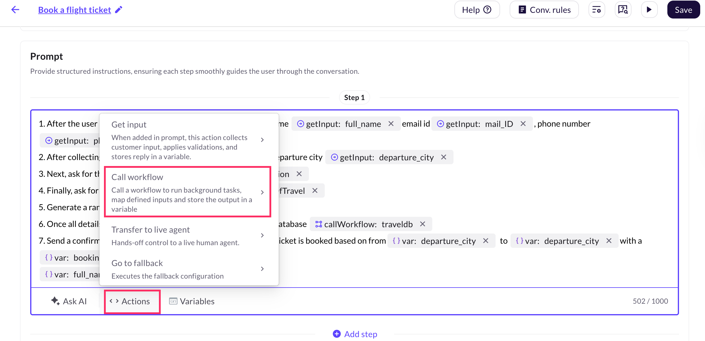 Once the workflow is defined, connect it to your conversation using the Call workflow action in the prompt section.