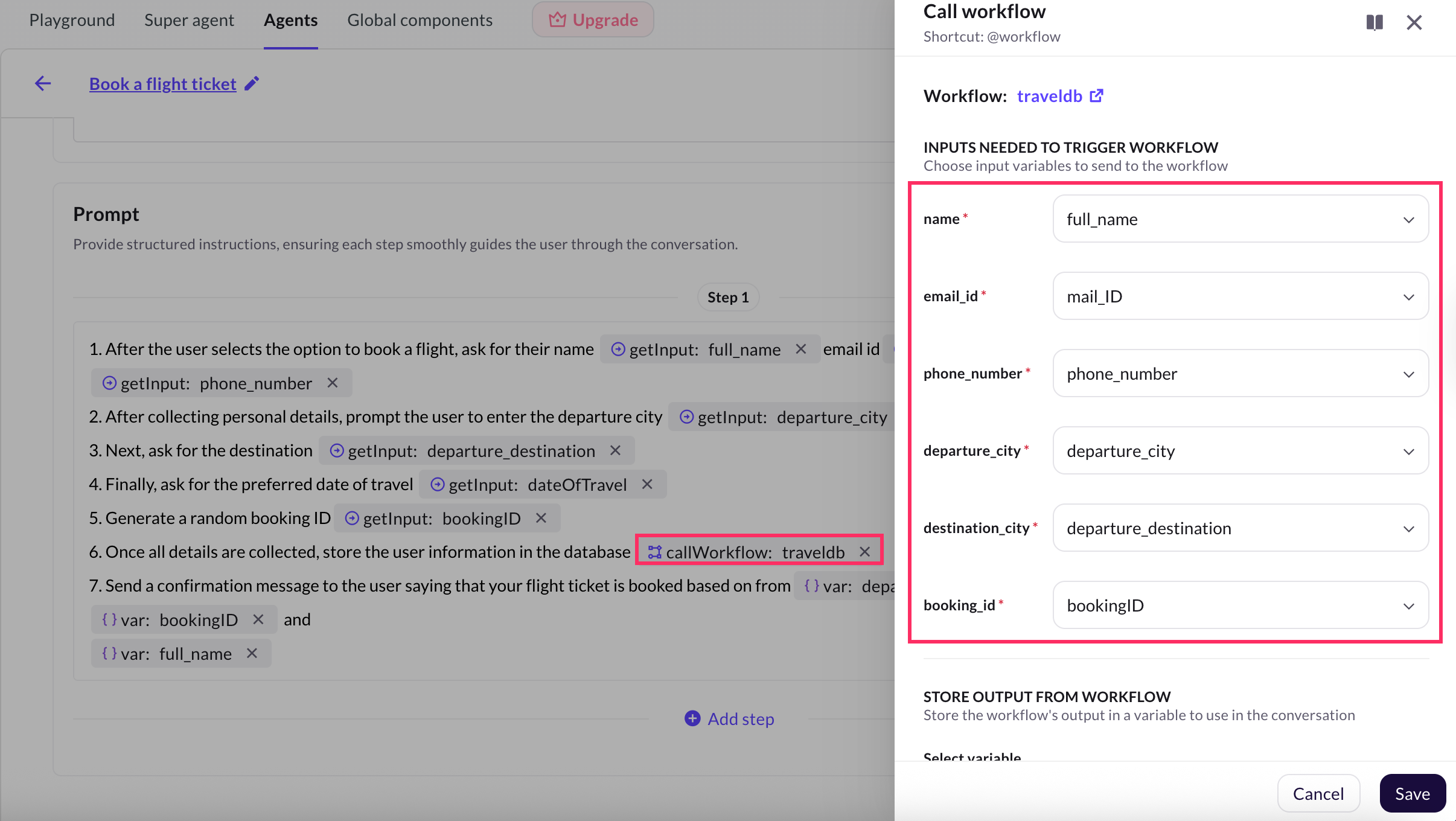 Store output | The workflow’s response (e.g., booking status, payment confirmation) is stored in a variable for use in subsequent conversation steps. |