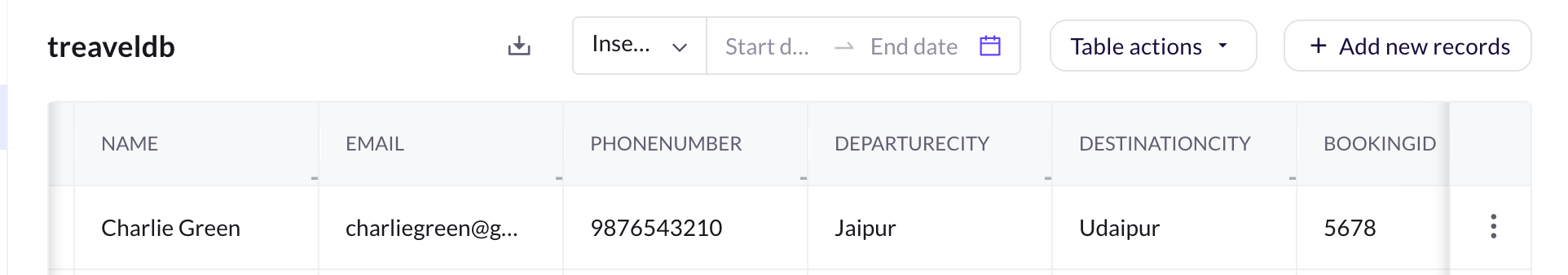 Create a database with columns matching the fields you want to store (example, name, phone number, destination).
