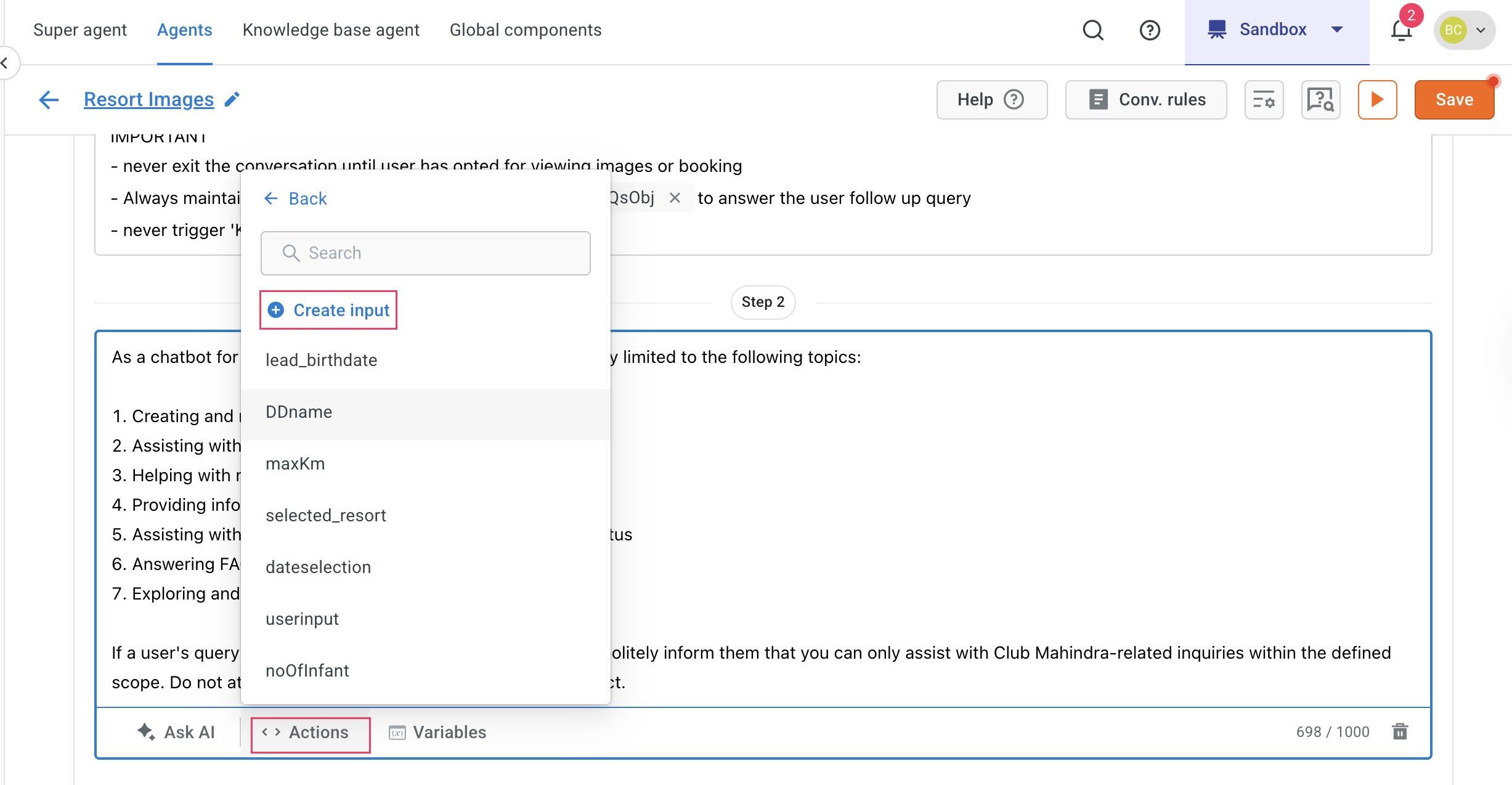 Input name | Enter the name of the custom variable where the user's input will be stored. This variable can be used in the conversation. |