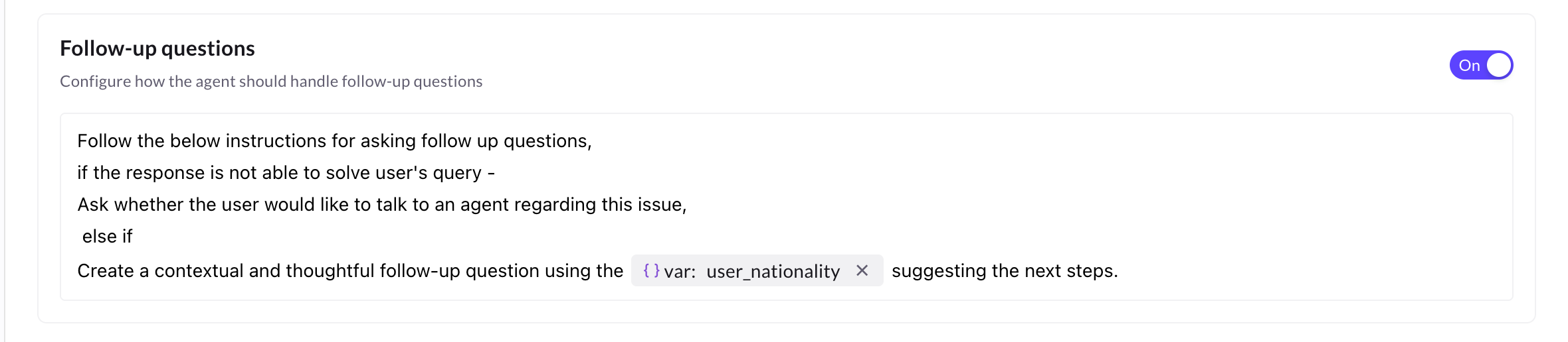 To enable this behavior, turn on the Follow-up questions toggle in the configuration section. Once enabled, the Kb agent will evaluate each response and decide whether to suggest a relevant follow-up based on the outcome.