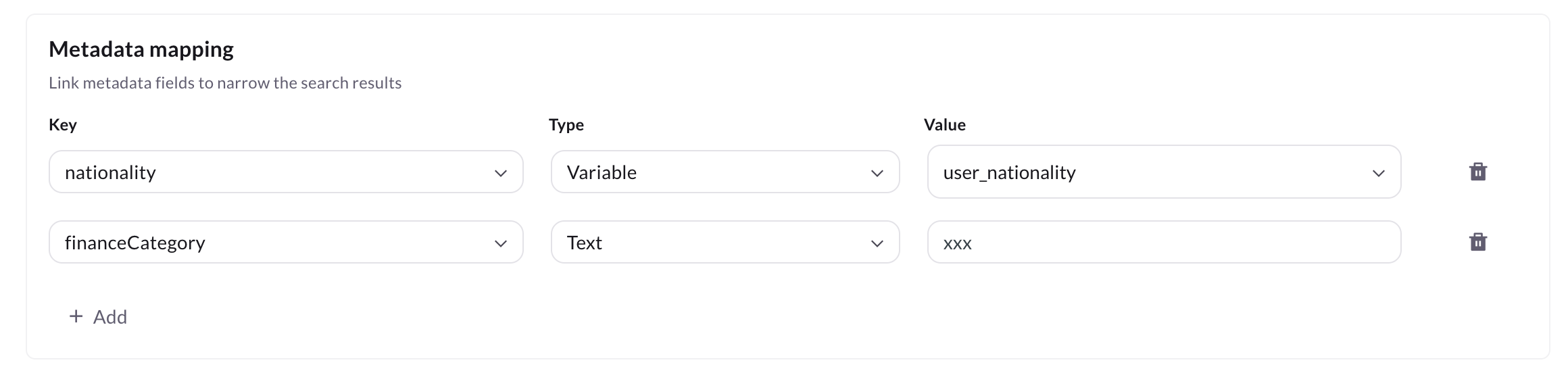 Variable: Use this when the metadata value should come dynamically from the conversation using a stored variable (example, user input or session data). The value is not fixed it depends on the user's response at runtime. Useful for personalized searches or filtering content based on user context.