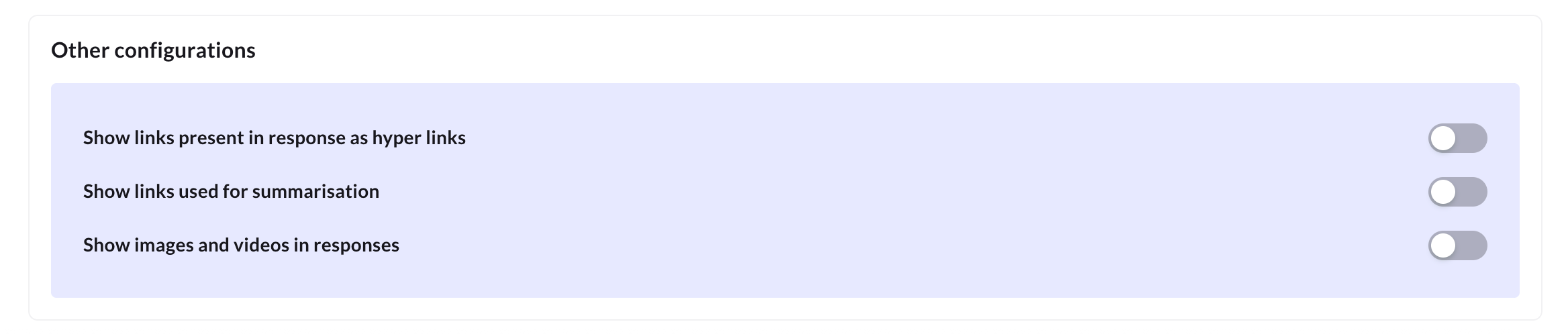 Show links used for summarisation | When enabled, the Kb agent displays the source links it referred to while generating the summary. | If enabled, users might see a source like: “Based on information from https://example.com/policy at the end of the response. |
