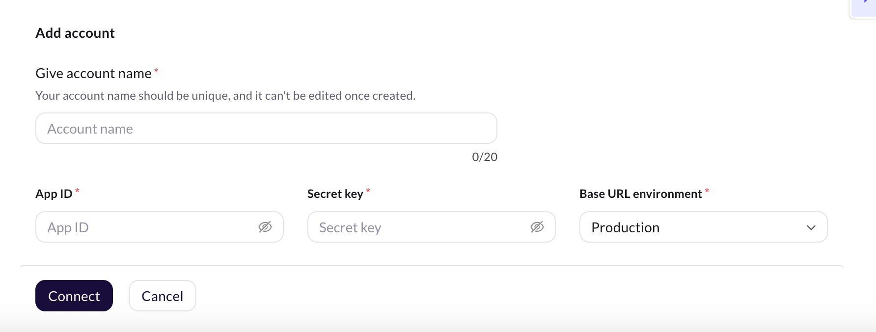 In Give account name, enter a unique name for the integration. You can use only lowercase alphanumeric characters and underscores (_).