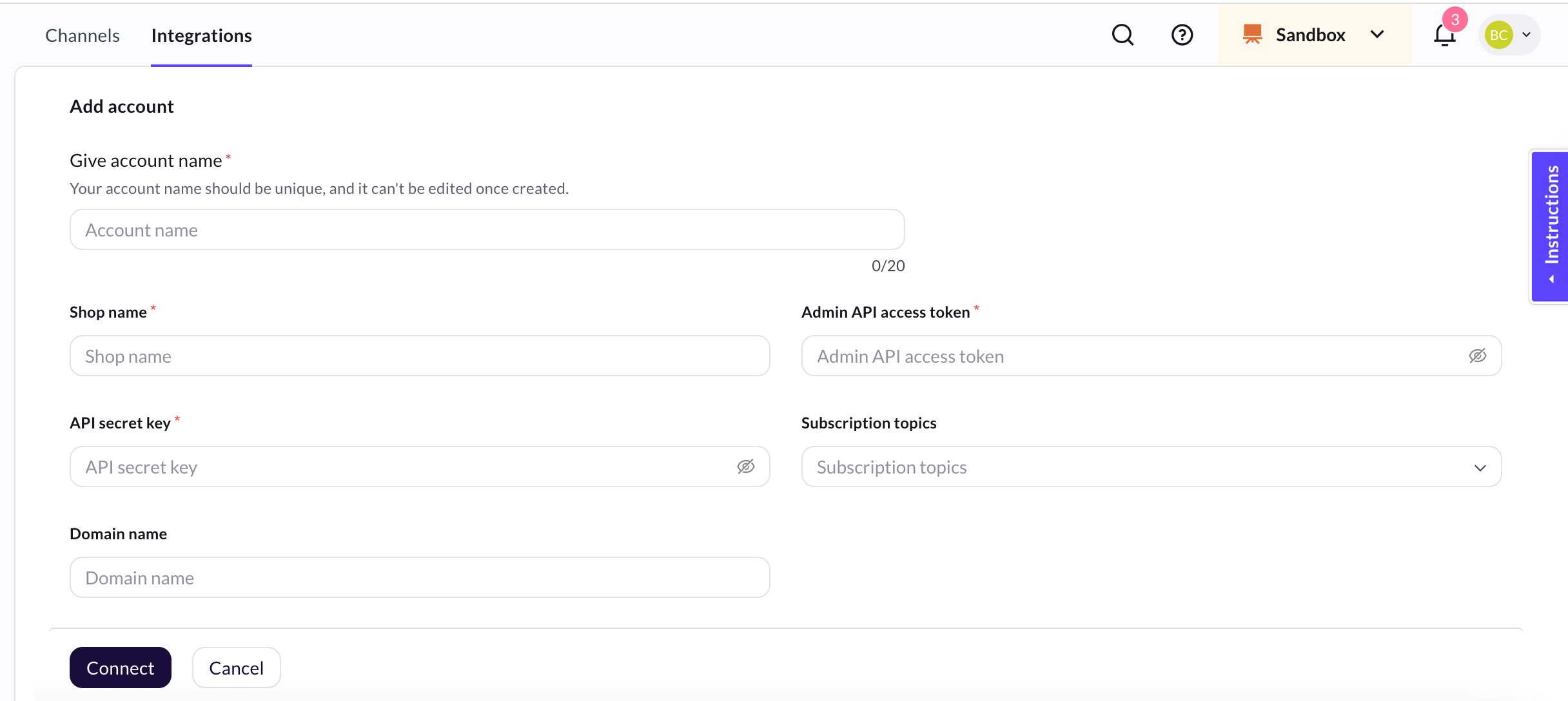 Option Description Give accout name Provide a name to Shopify account to be connected. Shop Name Name of your shop in Shopify. The shop name should be taken from the Shopify store URL, for example if the merchant store URL is yellowxyz.myshopify.com,the shop name would be yellowxyz. Admin API Access Token Copy and paste this from your Shopify store (refer step 8). Please only enter the Admin API access token that is displayed during the app creation process on Shopify. API Secret Key Copy and paste this from your Shopify store (refer step 8) Subscription topics Allows you to select events from the drop-down list. These events represent specific actions in your Shopify store, such as customer creation, order fulfillment, refunds, or product creation. While creating an account, you need to select the required events. Based on your selection, these events will appear in the Events section of your Yellow.ai platform. Domain name Domain name refers to the URL or web address that directs customers to your online store. Enter the domain name to enable Yellow to ingest the script on the store and capture user-related events for User 360. For example, yellowxyz.myshopify.com. -