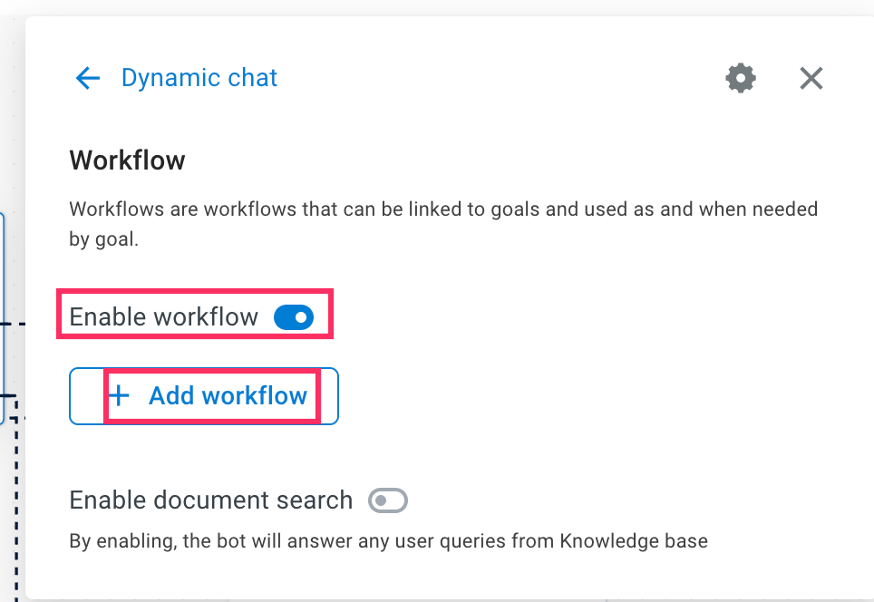 Workflow configuration enables you to create workflows that can be linked to goals and invoked as needed within a conversation. These workflows operate in the background while control remains in the dynamic chat node.