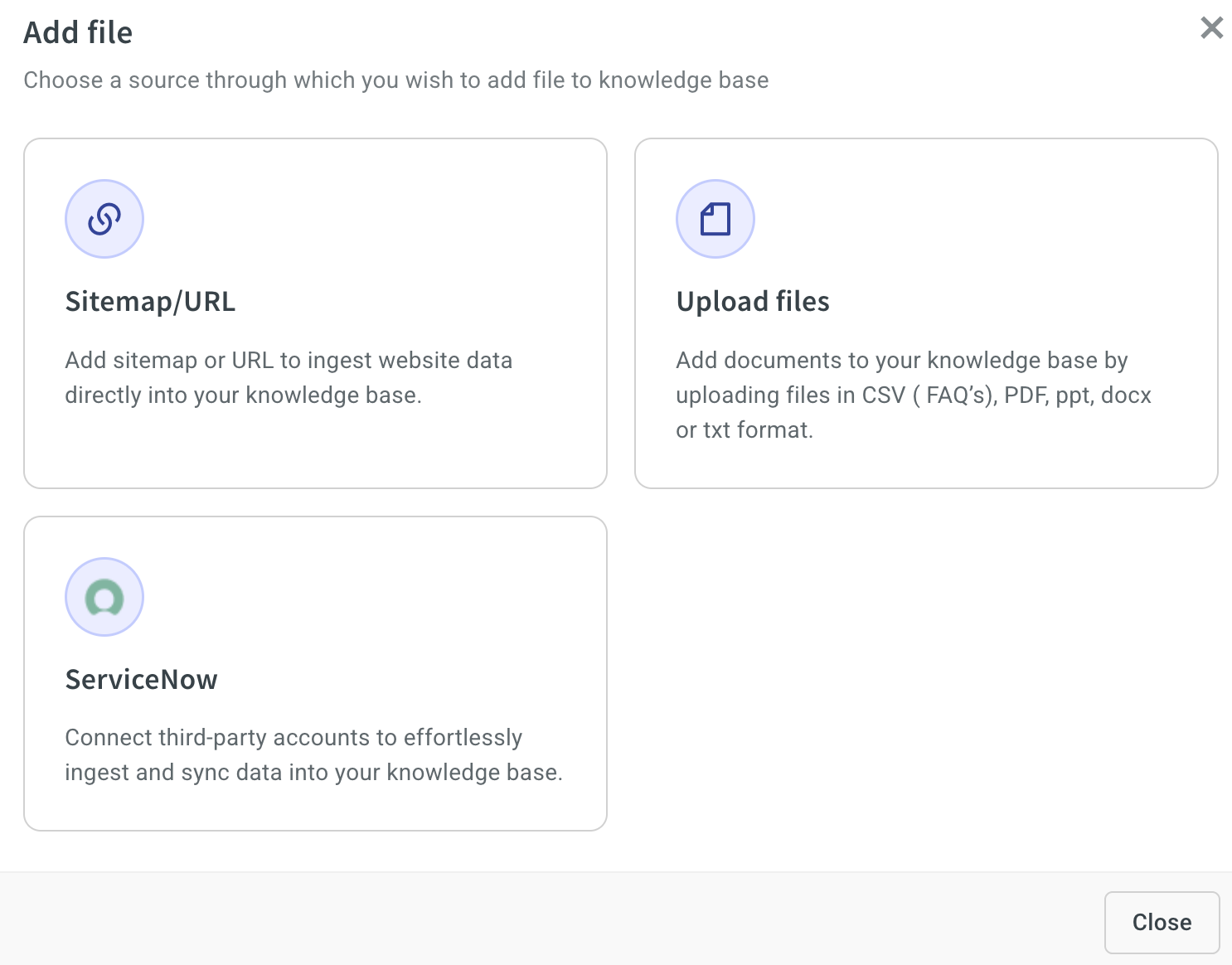 - ServiceNow: Integrate your ServiceNow knowledge base by syncing articles directly into the platform.