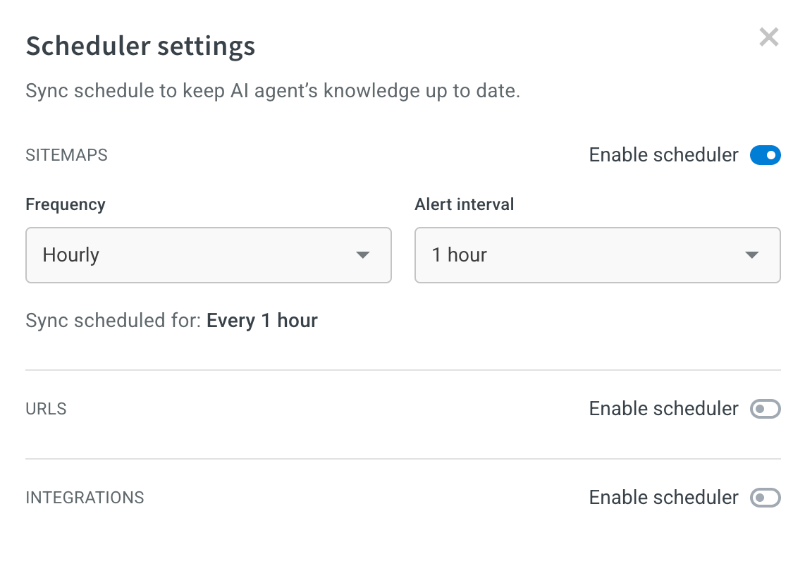 To keep your Knowledge Base content up to date, you can configure automatic synchronization. This is useful for content sources that change frequently, like websites or dynamic knowledge platforms. Scheduled syncs ensure your AI agent always references the most current information.